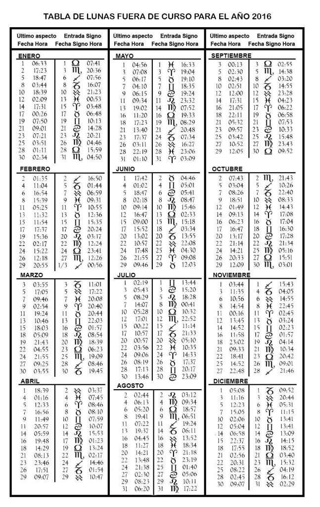 Tabla de lunas fuera de curso para el año 2016