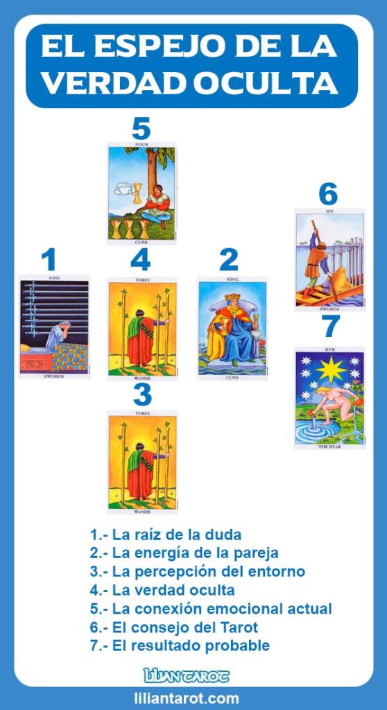 Esta tirada ha sido diseñada por Lilian Rodríguez con fines de reflexión y autoconocimiento, y no pretende sustituir el diálogo abierto y sincero en las relaciones de pareja ni el asesoramiento profesional en caso de conflictos graves. El propósito de El Espejo de la Verdad Oculta es ofrecer una guía para explorar las dinámicas emocionales y energéticas dentro de una relación, siempre desde un enfoque respetuoso y constructivo.